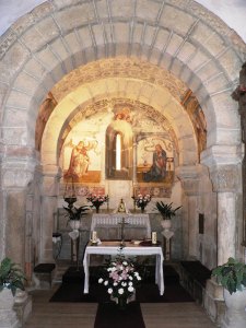 Estamos agora diante da igrexa románica (s. XII) de Santa María, na que a rusticidade e sinxeleza do presbiterio, engalanado con pinturas murais do s. XVI, lembra á arte prerrománica.