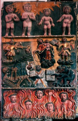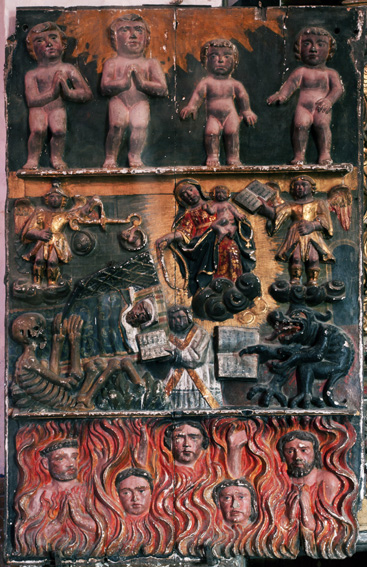 A mensaxe é clara. Antes ou despois chegaranos a nosa hora e debemos estar preparados. A presenza do demo sempre estará aí, axexando, pero a devoción ábrenos o camiño da salvación. En calquera caso, chegado o momento, se seguimos o recto camiño, pasaremos un tránsito polo lume purificador do Purgatorio onde nos prepararemos para a gloria eterna. É a escena que o artista nos representa no campo inferior da súa obra: as ánimas do purgatorio expiando as súas culpas cun xesto sereno e piadoso. Este tránsito será tanto máis breve canto maior sexa o número de misas que deixemos fundadas. Mesmo en vida podemos acurtar este proceso se contribuímos cos gastos da Igrexa por medio das bulas e indulxencias. O obxectivo ben o merece, trátase da gloria eterna. Esta é a escena que se representa no campo superior, onde vemos os corpos puros e espidos dos homes que alcanzaron o Paraiso. Tras eles, uns raios de luz celestial ilumínanos. Así de fácil.