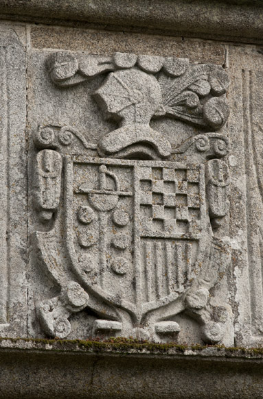 | Escudo de armas de los Feijóo Sotomayor y Valcarce que se encuentra a la entrada de la Casa de Vilastrille, en Proendos. |