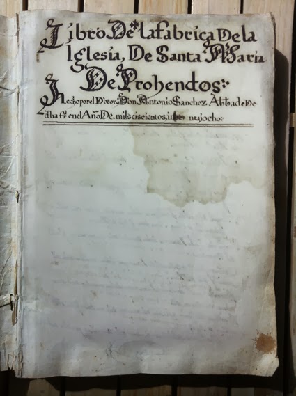 El libro de Fabrica objeto de nuestro artículo corresponde a la parroquia de Santa María de Proendos, perteneciente al Arciprestazgo de Amandi, conservado actualmente en el Archivo Diocesano de Lugo. Data del año 1697 y abarca hasta la primera década del siglo XIX coincidiendo con la invasión de las tropas napoleónicas. Se trata de un libro tamaño folio encuadernado en pergamino, de 186 hojas numeradas, con un gramaje de papel de unos 100 gramos de peso aproximadamente y buena factura. Sin duda se trata del segundo tomo de los que se cumplimentaron en esta parroquia ya que en sus primeras páginas el cura don Antonio Sánchez transcribe un resumen del estado de las cuentas y las deudas de los feligreses que se “hallaban en el libro viejo”, el cual desgraciadamente no ha llegado hasta nuestros días.