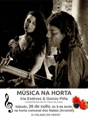 O 26 de xullo, para presentarvos a horta comunal de boas prácticas do Colado do Vento, temos un concerto de luxo: Iria Estévez e Gonzo Piña, de En Clave de Fado, ofrecerannos un concerto.