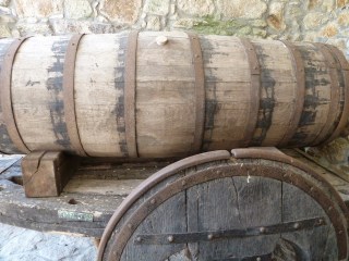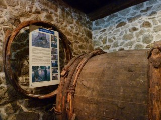Antes de pasar á sala relacionada cos traballos do viño, topamos unha “pipa carrela”, chamada así por ter a mesma lonxitude que o carro, que se usaba para transportar o viño ou, como sinalou o Quintín, para carretar auga dende a fonte a un alxibe da casa.