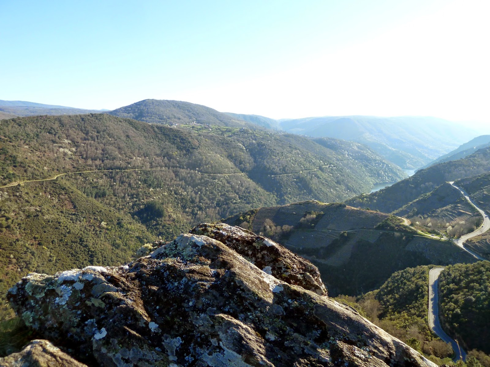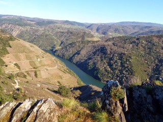 E divisaremos á dereita a zona de viñedos aterrazados con maquinaria da adega Regina Viarum.